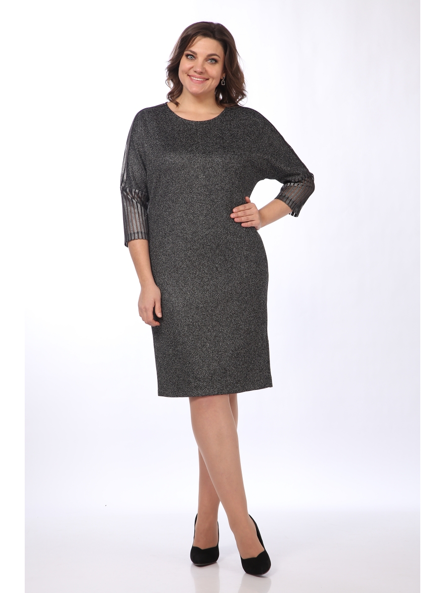 Платье женское, прямого силуэта, из трикотажного полотна. С круглым вырезом горловины. С пришивными украшениями. Перед платья с нагрудными вытачками. В боковых швах карманы. Спинка состоит из боковых деталей и центральной вставкой со складкой, в верхней части собрана на венгерку, на подкладке. Рукава втачные, одношовные, длиной 3/4.