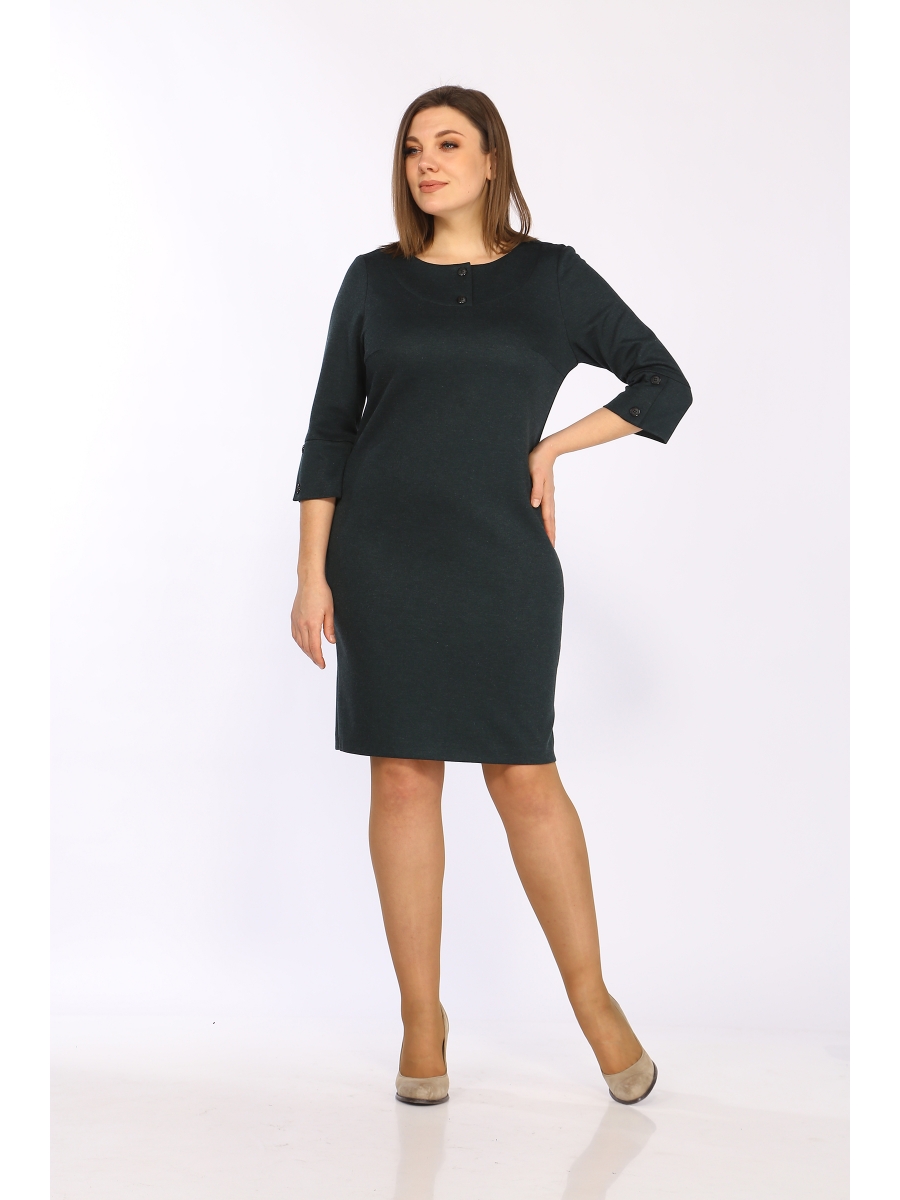 Платье женское, прямого силуэта из плотного трикотажного полотна. Перед платья с круглым вырезом горловины, обработанным отделочной деталью из двух частей, с имитацией застежки на две большие фигурной формы пуговицы, сочетающиеся с цветовой гаммой изделия. Перед с нагрудными вытачками. Спинка со средним швом, заканчивающимся разрезом. Рукава втачные, одношовные, длиной 3/4. Низ рукава обработан широкой притачной манжетой, с имитацией застежки на две большие пуговицы фигурной формы. Размеры 48-52: длина платья 95 см, длина рукава 47 см.