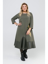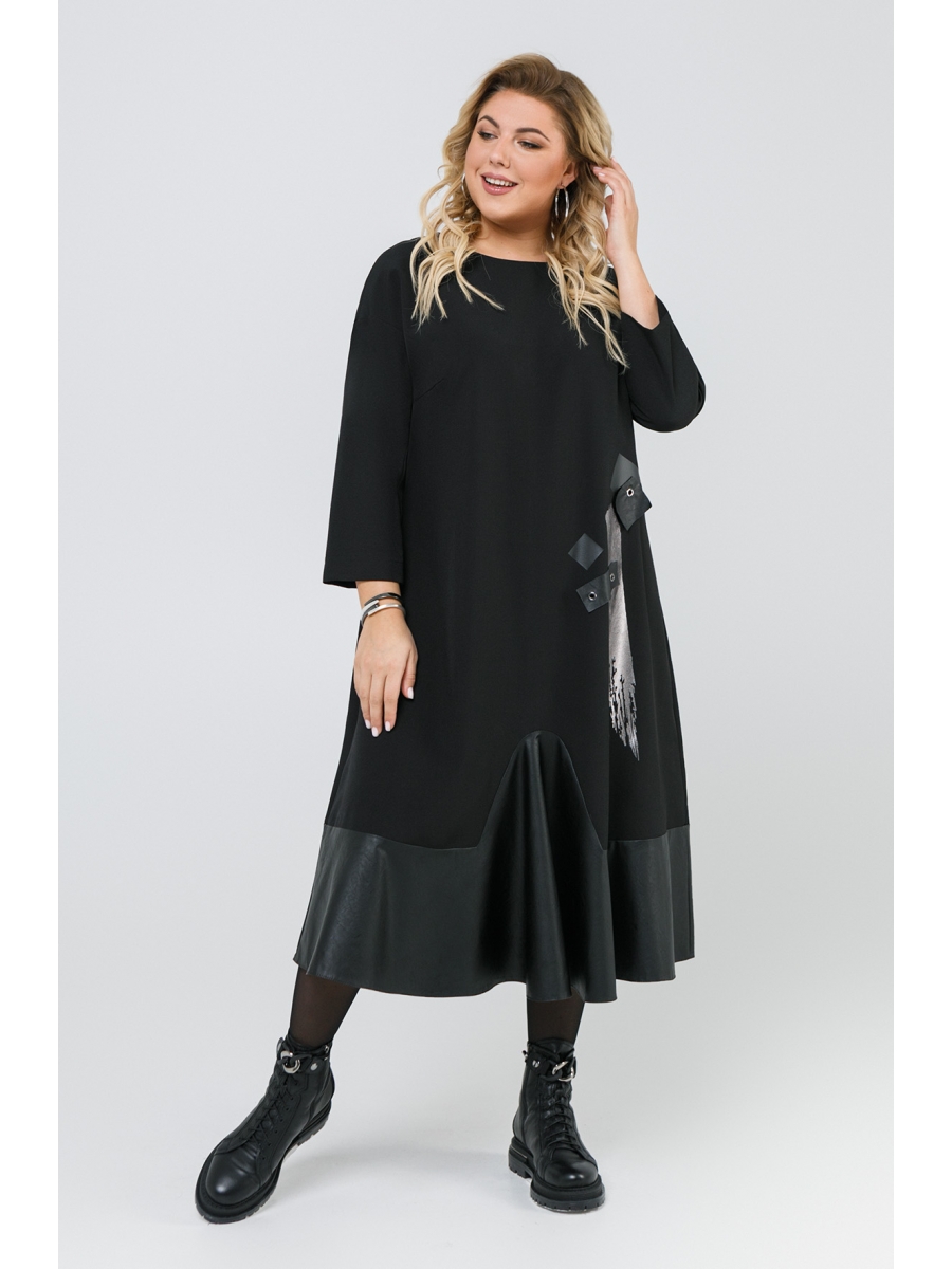 Оформить заказ →Женское платье расширенного к низу силуэта, выполненное из ткани костюмно-плательного ассортимента, отделкой служит эко-кожа. Из эко-кожи выполнен широкий волан по низу платья с фигурной линией притачивания. По переду справа в области бедер есть крупная печать с дополнительной отделкой из квадратных кусочков эко-кожи, которые крепятся к детали переда с помощью сквозных люверсов. Вырез горловины округлый. Рукав втачной со спущенной линией плеча.