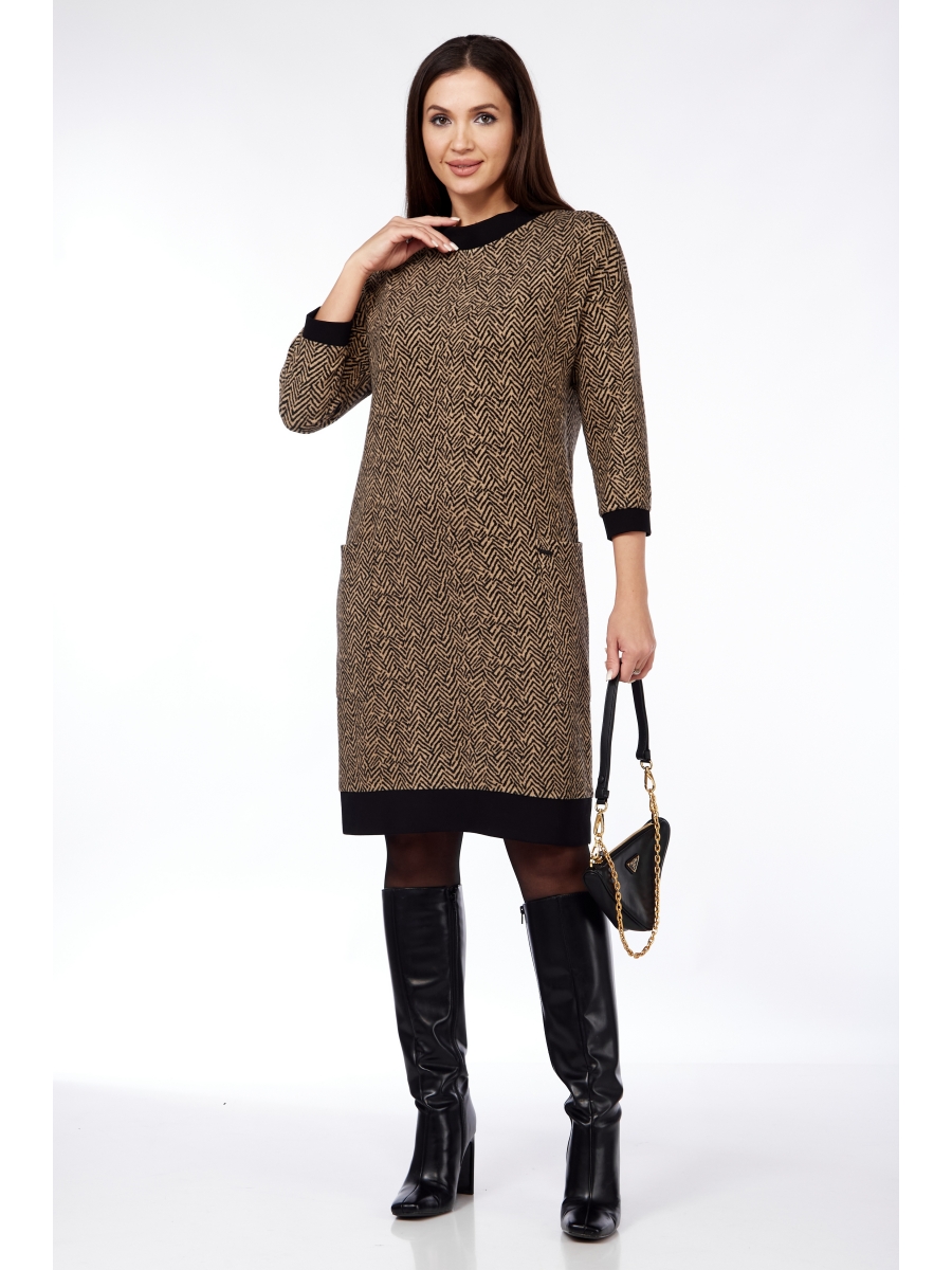 Универсальное трикотажное платье-туника прекрасно впишется в Ваш гардероб. Изделие прямого силуэта свободного кроя с накладными карманами, украшением на кармане служит небольшая брошь. Рукав ¾, манжет рукава, а также горловина и низ платья - трикотаж. Простое, но такое комфортное изделие станет одним из ваших любимых в осенне-зимний период. Платье отлично смотрится, как самостоятельное изделие, а также смело может сочетаться с различной одеждой и обувью.