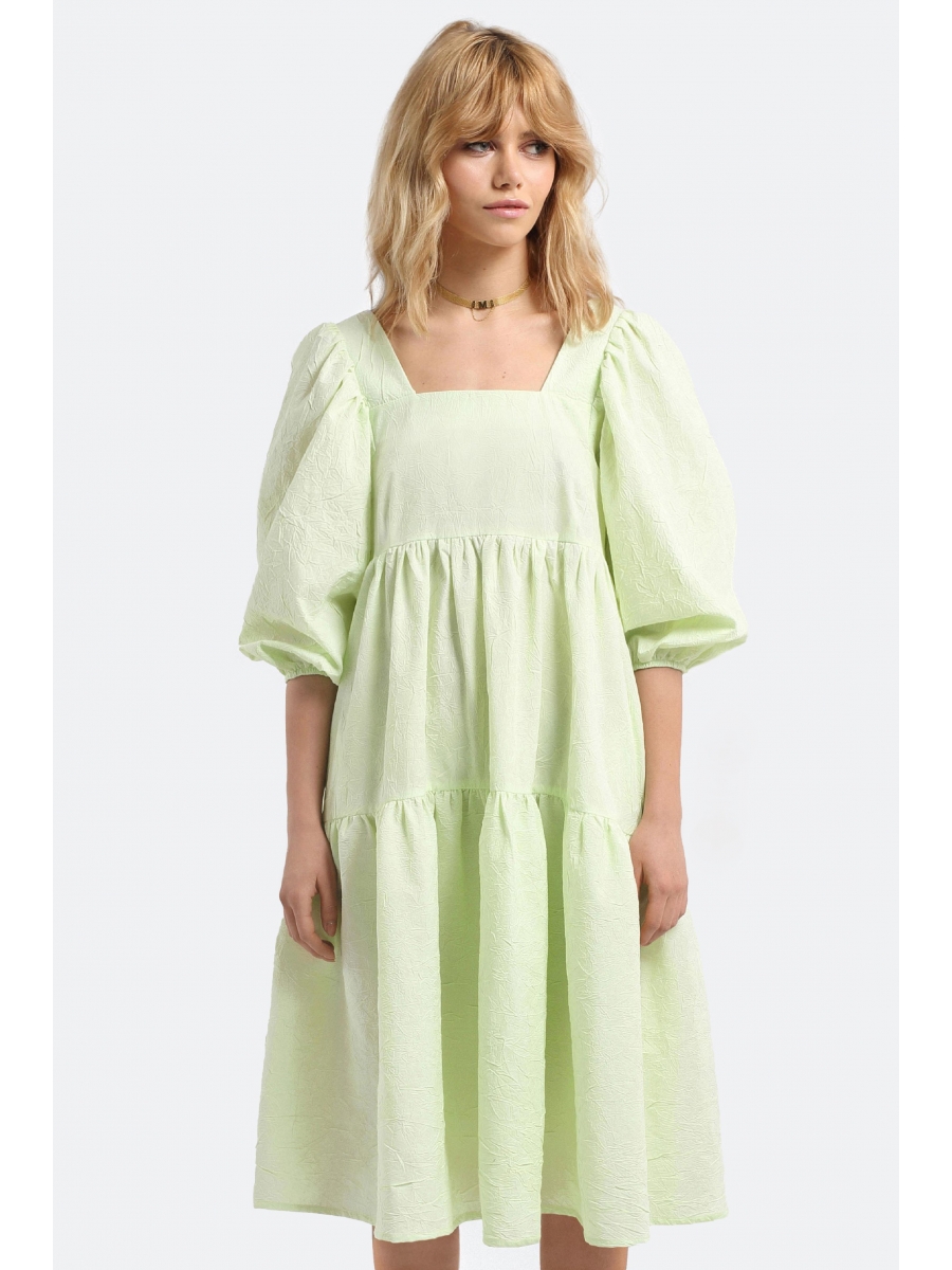 Оформить заказ →Хлопковое ярусное платье в стиле бэби-долл из текстильной ткани с эффектом «крэш». Детали: трапециевидный силуэт, завышенная линия талии, квадратный вырез горловины переда и спинки, нагрудные и талиевые вытачки, фигурные проймы, короткие пышные рукава с резинкой по низу, потайная застежка в среднем шве спинки, карманы в швах.