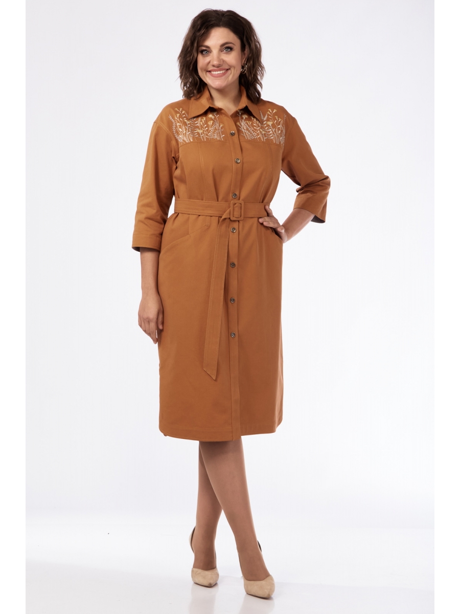 Платье женское прямого силуэта изготовлено из х/б плательной ткани. Воротник рубашечного типа, застежка центральная планка на петли и пуговицы. Перед с кокетками и фигурными рельефами, в которых обработаны карманы. По спинке кокетка со складками. Рукав слегка спущенный, длиной ¾ с манжетой из отделочной ткани, Низ платья фигурной формы, обработан обтачкой. Пояс из основной ткани с пряжкой. Платье декорировано вышивкой.