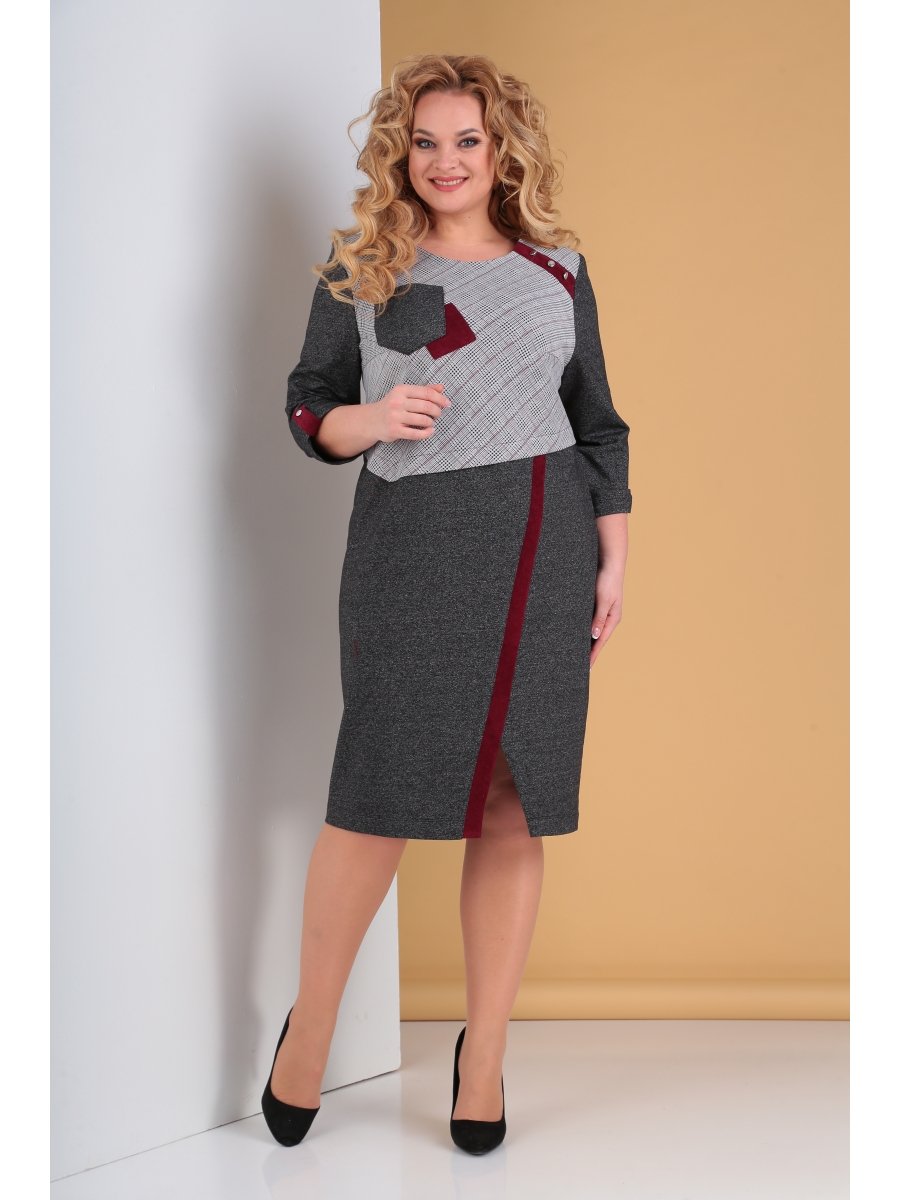Платье прямого силуэта, отрезное в районе талии. Перед асимметричный, с нагрудными вытачками, накладным карманом на груди и разрезом по низу изделия. Спинка со средним швом в нижней части. Рукав втачной, длиной 7/8, снизу собирается патой. Горловина овальной формы, обработана обтачками. Отделкой изделия служит металлическая фурнитура (может отличаться от представленной на фото).