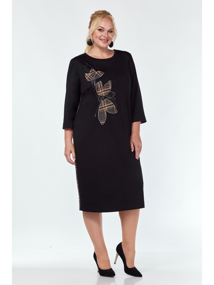 Платье женское повседневное выполнено, путем комбинирования ткани двух видов трикотажного полотна и из костюмно-плательной ткани в клеточку. Прямого силуэта. В боковых обработаны карманы. По переду дизайнерская вышивка. Рукава втачные длиной ⅞ с отложной манжетой из отделочной ткани.