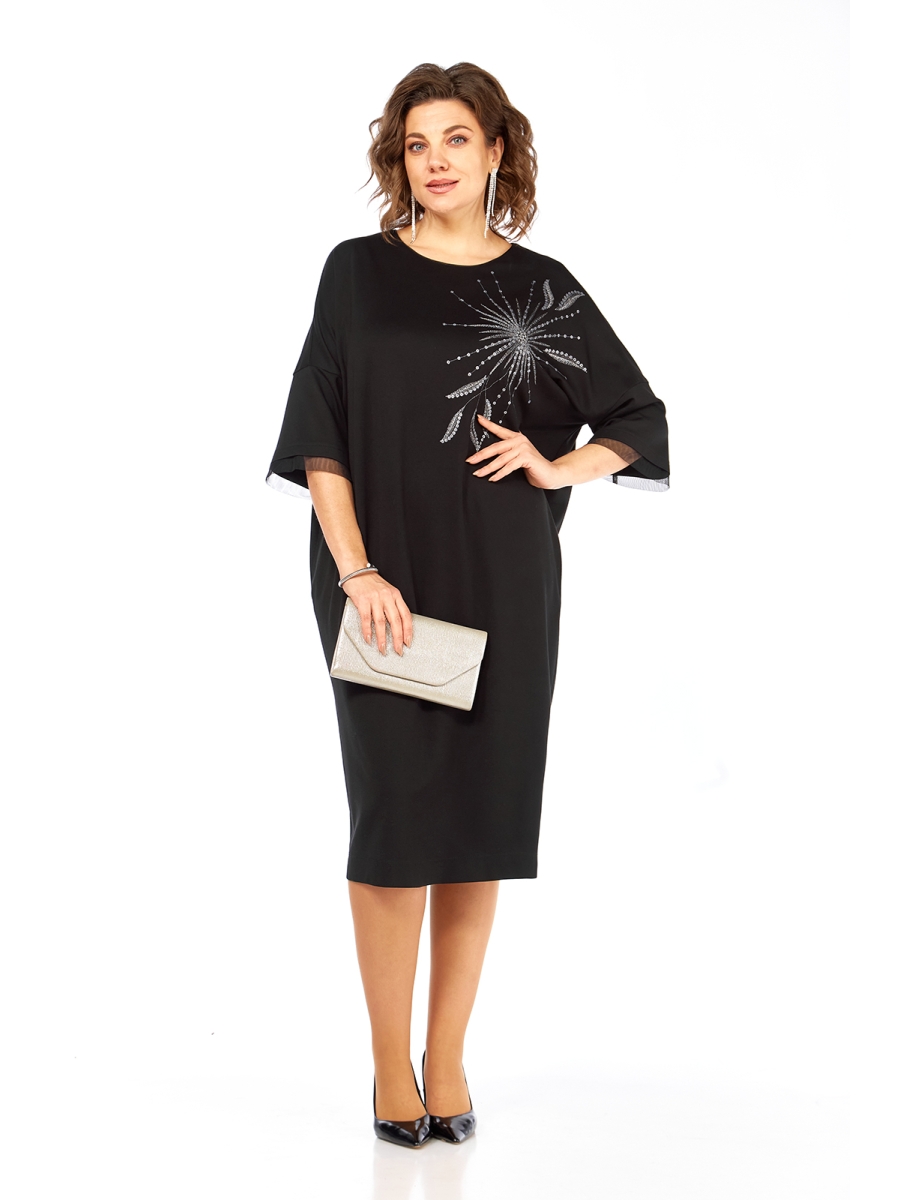 Платье женское, нарядное, изготовлено из трикотажного полотна. Горловина круглой формы, с кантом. На полочке дизайнерская вышивка. Спинка со средним швом и декоративной застежкой вверху. Рукава спущенные, длиной ¾, с сеткой по низу.