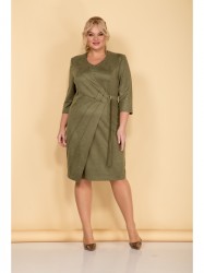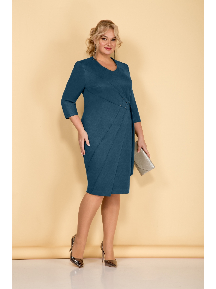 Элегантное платье полуприлегающего силуэта, слегка зауженное к низу, выполнено из мягкого, фактурного материала(«замша-диагональ»). Платье лаконичного кроя, акцентом служит отлетная часть переда с декоративными защипами, фиксирующаяся на талии при помощи пояса.