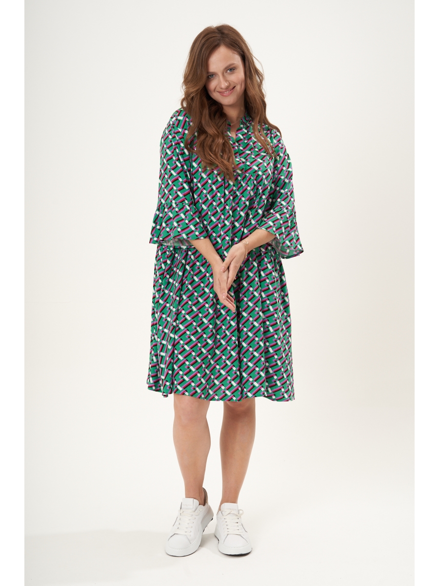 При выборе платья предлагаем остановить свой выбор на модели из лёгкой ""дышащей"" ткани, воздухопроницаемой, струящейся. Платье свободной конической формы, рубашечного силуэта в актуальной миди-длине. Рукава длиной 3/4 на спущенной линии проймы с воланом по низу.