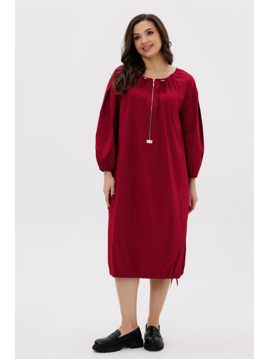 Свободный силуэт, рубашечный рукав, круглая расширенная горловина с кулисой и эластичной тесьмой. Полочка с вертикальными рельефами от горловины, застёжкой на декоративную молнию в верхней части, отделочными высокими вытачками от низа центральной части. Спинка с центральным швом, вертикальными рельефами. Рукав со встречной складкой по окату и эластичной тесьмой по низу. По низу платья кулиса с эластичной тесьмой.