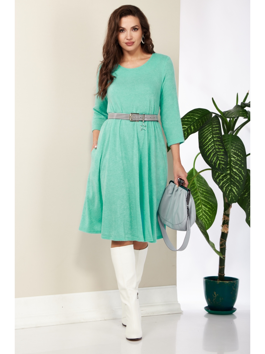 "Платье женское трапециевидного силуэта, из мягкого трикотажного полотна. Перед платья цельный, расширенный к низу, по боковым швам карманы полуовальной формы. Спинка платья стачная, расширенная к низу. Рукав-длиной 3/4 ,втачной,одношовный. Горловина овальной формы. Пояс в комплекте. Длина изделия: (50-54)-96см.(56-60)-103 см.,
