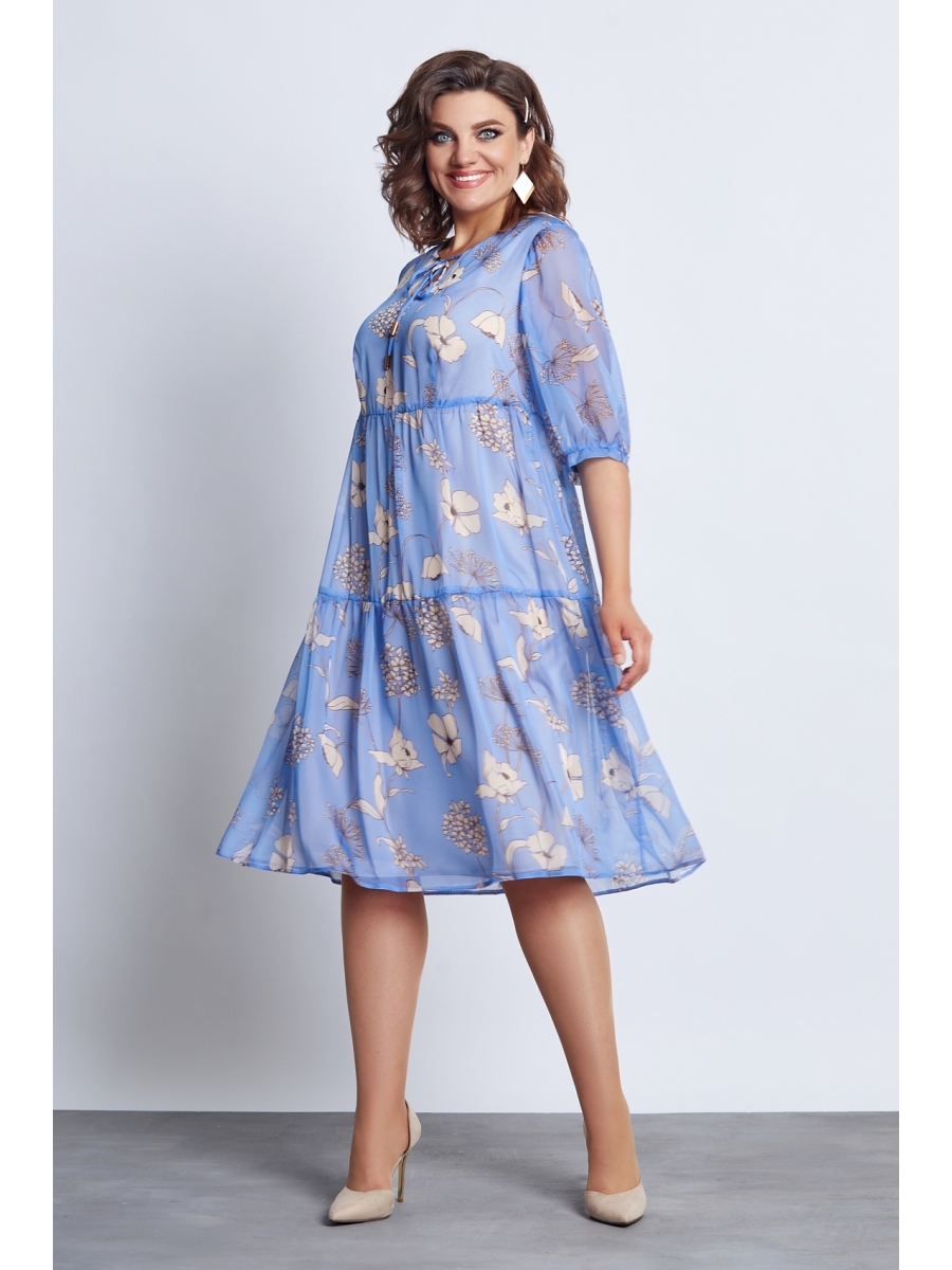 Нежное женское платье, свободного покроя, выполнено из шифона, на подкладке. Горловина округлой формы окантованная основной тканью, по середине лифа подрез, также на лифе обработаны нагрудные вытачки. На полочке платья выполнено два подреза с небольшой сборкой. Спинка идентична полочке. Рукав втачной, со сборкой по низу рукава, обработан манжетой.