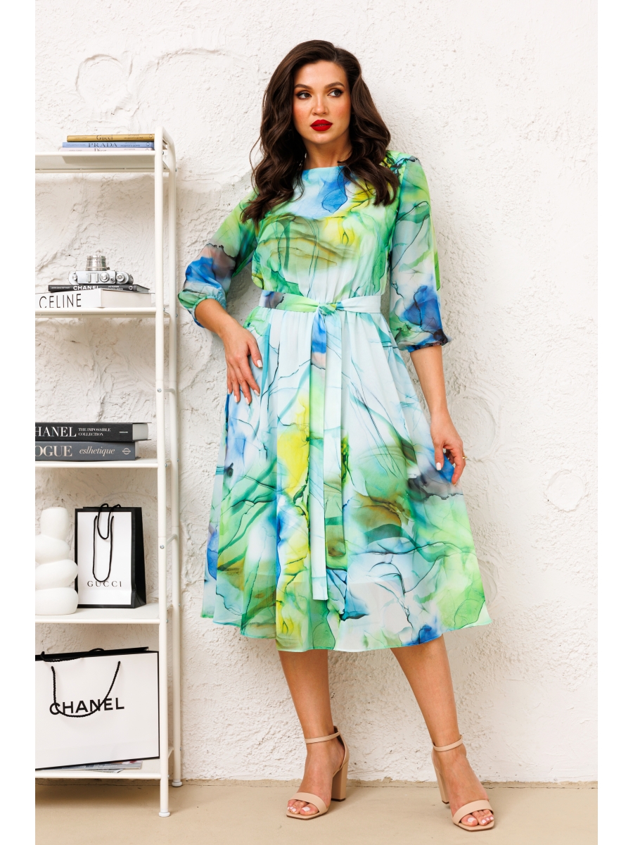 Роскошное женское платье полуприлегающего силуэта, расширенное к низу, выполнено из высококачественного шифона с модным дизайнерским принтом. Платье отрезное по талии со сборкой на резинке, полностью на трикотажной подкладке. Вырез горловины округлый, на обтачке. Рукава втачные, по низу собраны на узкую резинку.