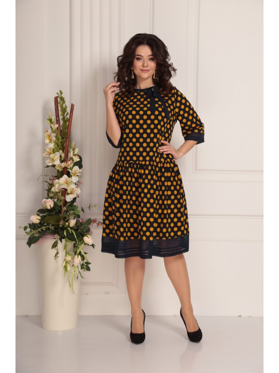 Оформить заказ →Платье женское, свободного силуэта из шифона на трикотажной подкладке. Рукава втачные, ниже уровня локтя, по низу пришиты манжеты из однотонной ткани, по манжетам застрочены горизонтальные складки. По платью ниже линии талии выполнен подрез, нижняя часть со сборкой , по низу пришита отделочная деталь с 3-мя складками из однотонной ткани. Горловина обработана планкой из однотонной ткани, по переду горловины пришит заготовленный бантик и с украшением.