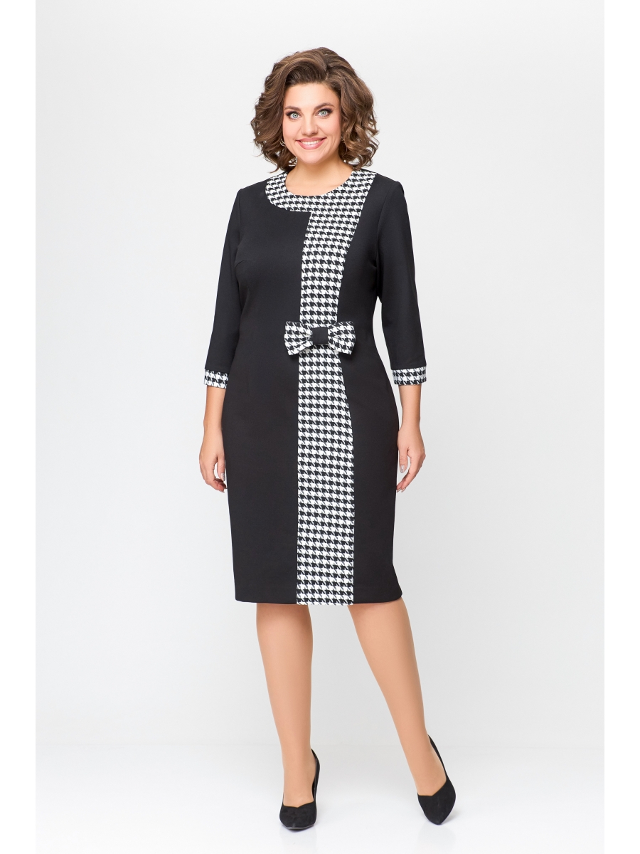 Передняя часть платья с отрезным рельефом из отделочной ткани по левой стороне, переходящим в кокетку, и нагрудной и талиевой вытачками по правой стороне. Спинка разрезная с талиевыми вытачками и молнией в среднем шве. Горловина округлой формы, обработана обтачкой. Рукав втачной одношовный длиной ¾ с манжетой из отделочной ткани шириной 3,5 см.