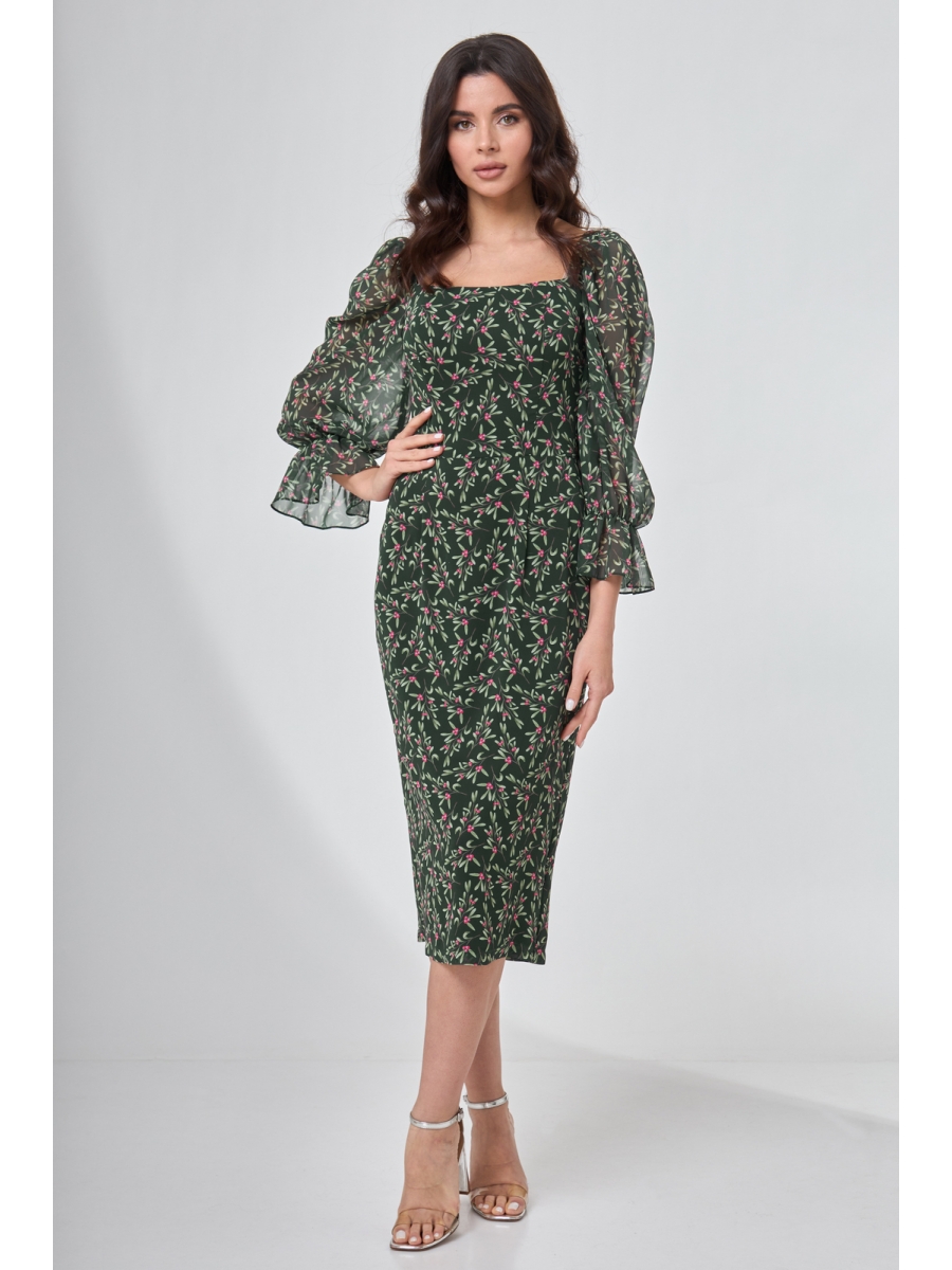 Платье приталенного силуэта, на подкладке. Вырез горловины квадратной формы. Отрезное по линии талии. Перед и спинка с рельефами. По спинке средний шов, в котором вставлена потайная молния, внизу разрез. Рукав втачной длиной 3/4, по окату присборен на резинку, в нижней части рукава сборка на венгерку.
