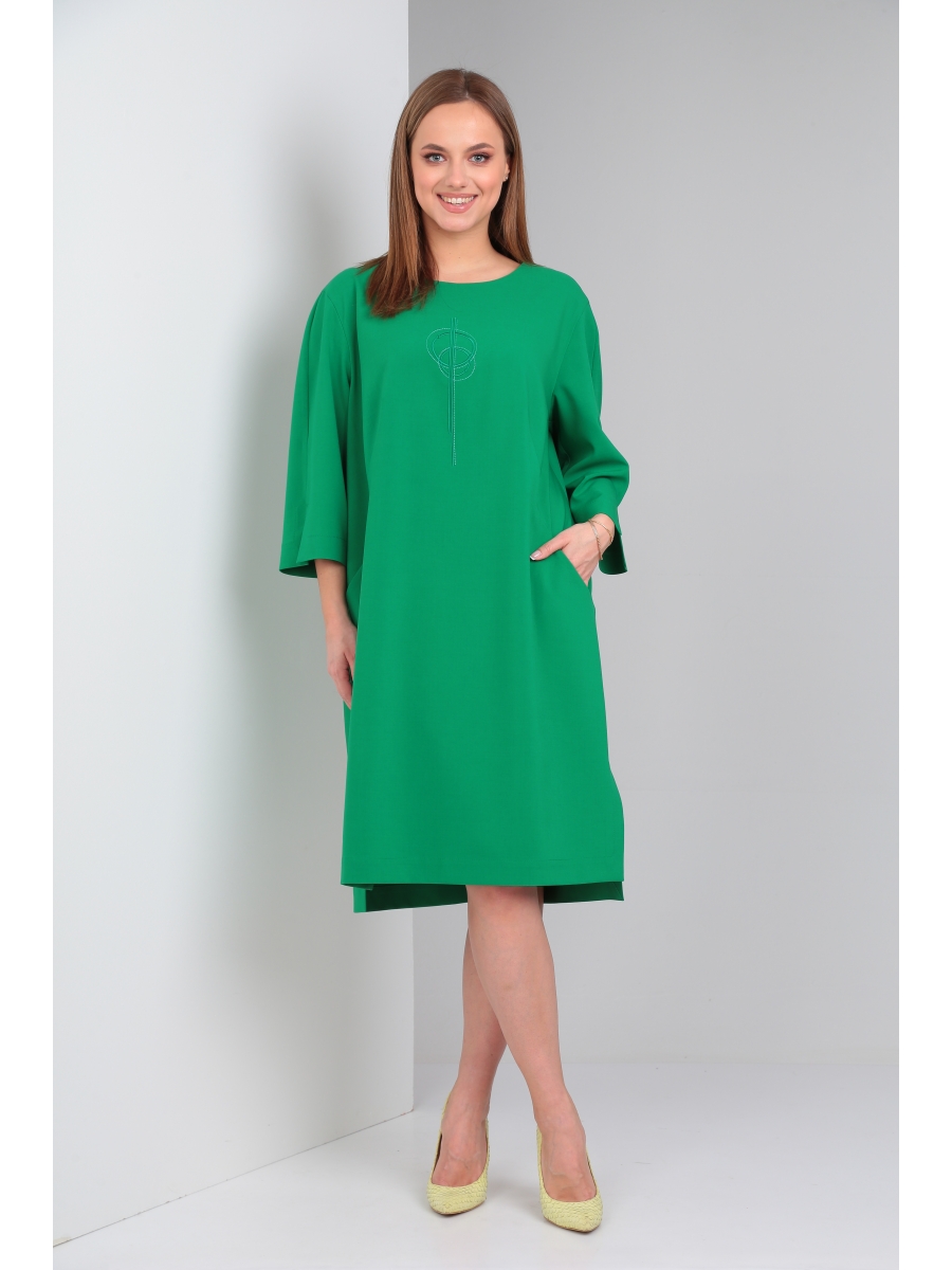 Платье женское прямого силуэта из плательно-костюмной однотонной ткани с эффектом креш. По переду декоративная вышивка в тон изделия, подрезы от линии груди до бокового с функциональными карманами. По спинке средний шов с застёжкой на потайную молнию сверху. Рукав втачной 3/4 слегка спущенный по линии плеча с верхним швом и разрезом по низу. Горловина округлой формы, обработана обтачкой.