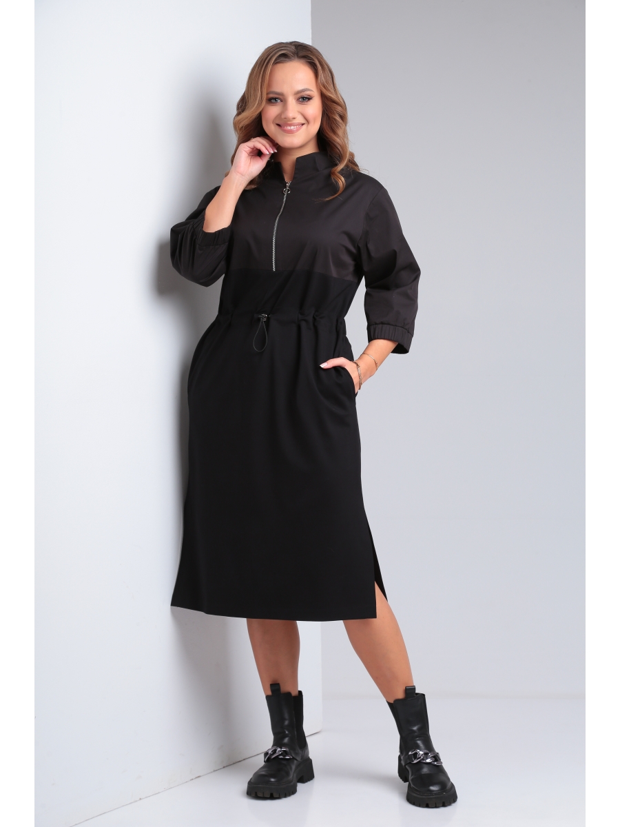 Платье женское комбинированное из двух тканей, свободного покроя, прямого силуэта. Отрезной лиф ниже уровня груди. По переду застежка на декоративную тесьму-молнию. По спинке средний шов. Линия плеча спущена. Горловина в виде цельнокроенной стойки. Рукав втачной присобран на широкую резинку по низу. Изделие приталивается кулисой. В боковых швах функциональные карманы и разрезы.
