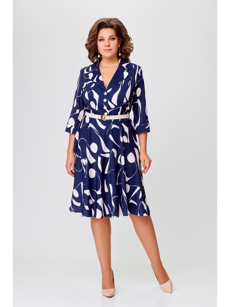 Платье из мягкой, струящейся вискозной ткани, Х-образного силуэта с полуприлегающим лифом. Платье отрезное по линии талии. Перед лифа с вертикальными рельефами и застёжкой на петли и 4 декоративные пуговицы. Горловина V-образной формы, с отложными лацканами и воротником пиджачного типа. Спинка лифа с талиевыми выточками. Рукав втачной, длиной ¾, по низу манжет с разрезом. Застёжка в боковом шве на потайную тесьму молнию. В комплекте пояс из основной ткани.