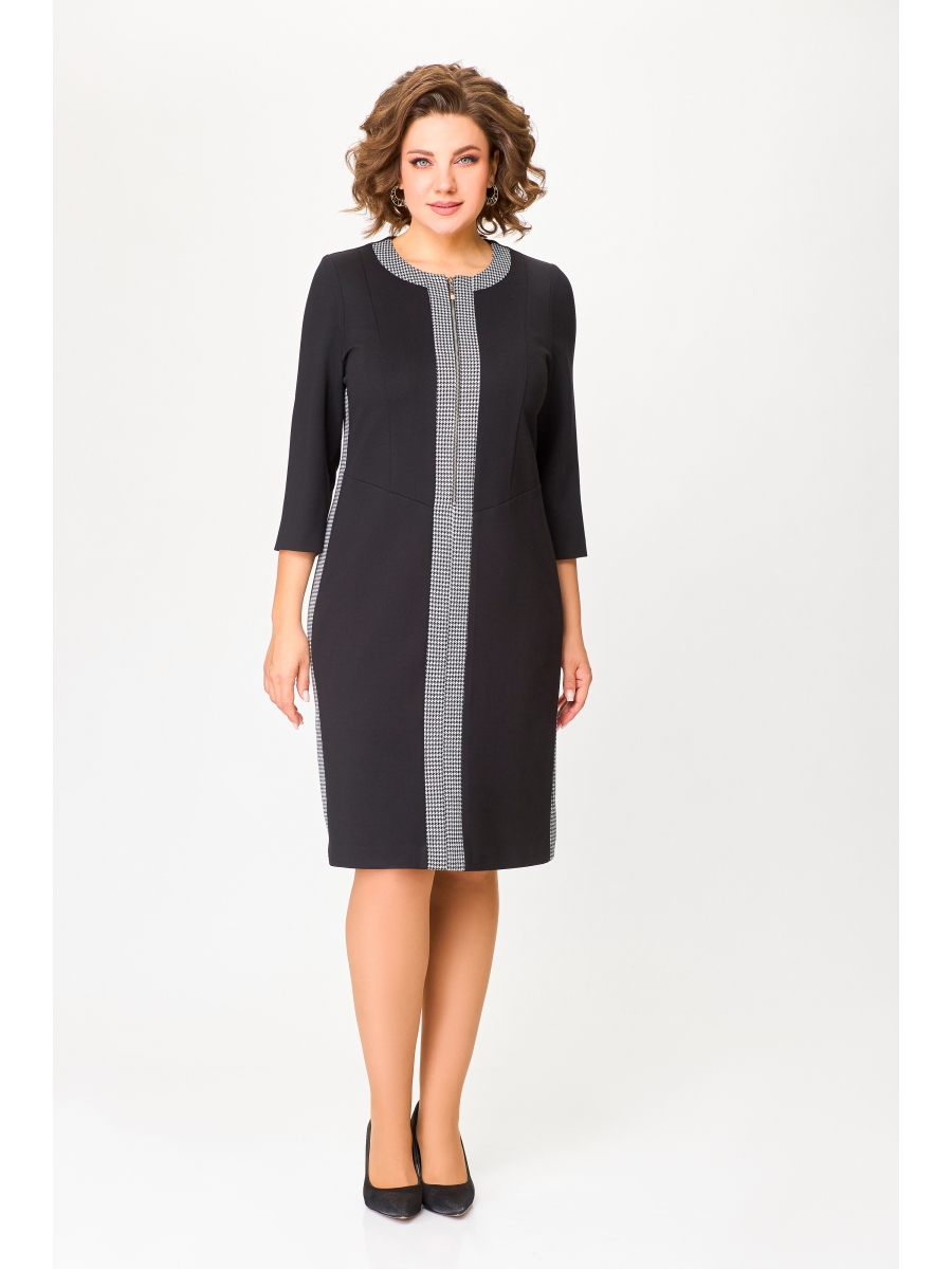 Платье полуприлегающего силуэта из эластичного трикотажного полотна. Спереди, по центру планка из декоративной ткани переходящая в отделку горловины. В верхней части планки металлическая молния, длиной 40 см. По бокам вставки из декоративной ткани. По спинке талиевые выточки, средний шов со шлицей. Горловина круглая, обработана обтачкой. Рукав одношовный, втачной, длиной ¾.