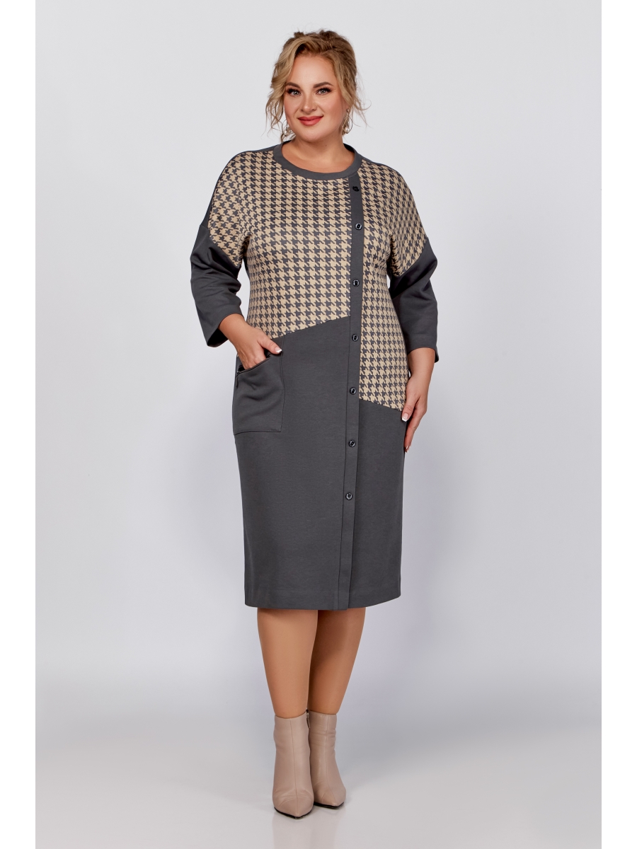 Оформить заказ →Платье прямого силуэта со спущенной линией плеча, скомбинировано из двух видов трикотажных полотен. Перед с косыми подрезами и смещённой от линии центра притачной планкой с декоративными пуговицами. В области бедра расположен накладной карман с функционирующей декоративной молнией. Спинка со средним швом. Пройма спущена, рукав длиной 7/8, горловина круглая.