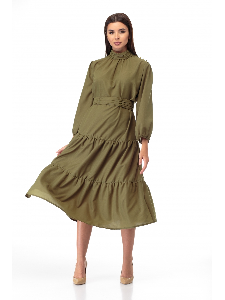 Восхитительный образ платья дополняет съёмный пояс из основной ткани с драпировкой верхней детали, застёгивающийся на красивые пуговки с навесными петлями.
