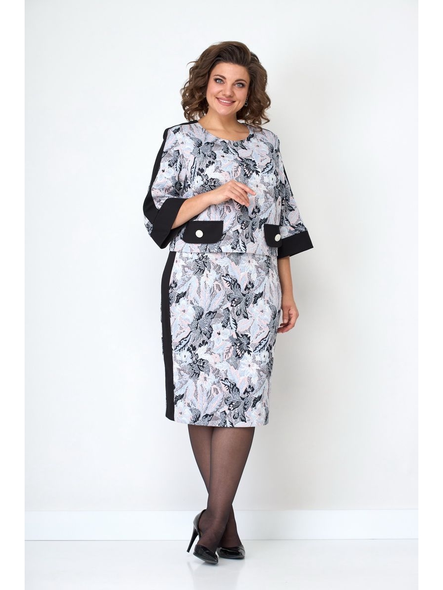Платье женское полуприлегающего силуэта из очень красивой костюмно-плательной ткани. Платье - имитация костюма. В качестве отделки используются пришивная тесьма по рукаву и по боковым швам. По переду нагрудные вытачки. Рукав ¾, чуть ниже уровня локтя. По спинке обработана потайная молния. Есть шлица. Платье на подкладке. Украшением платья служат пришивные карманы с пуговицами. Бережная стирка при 30 градусах!