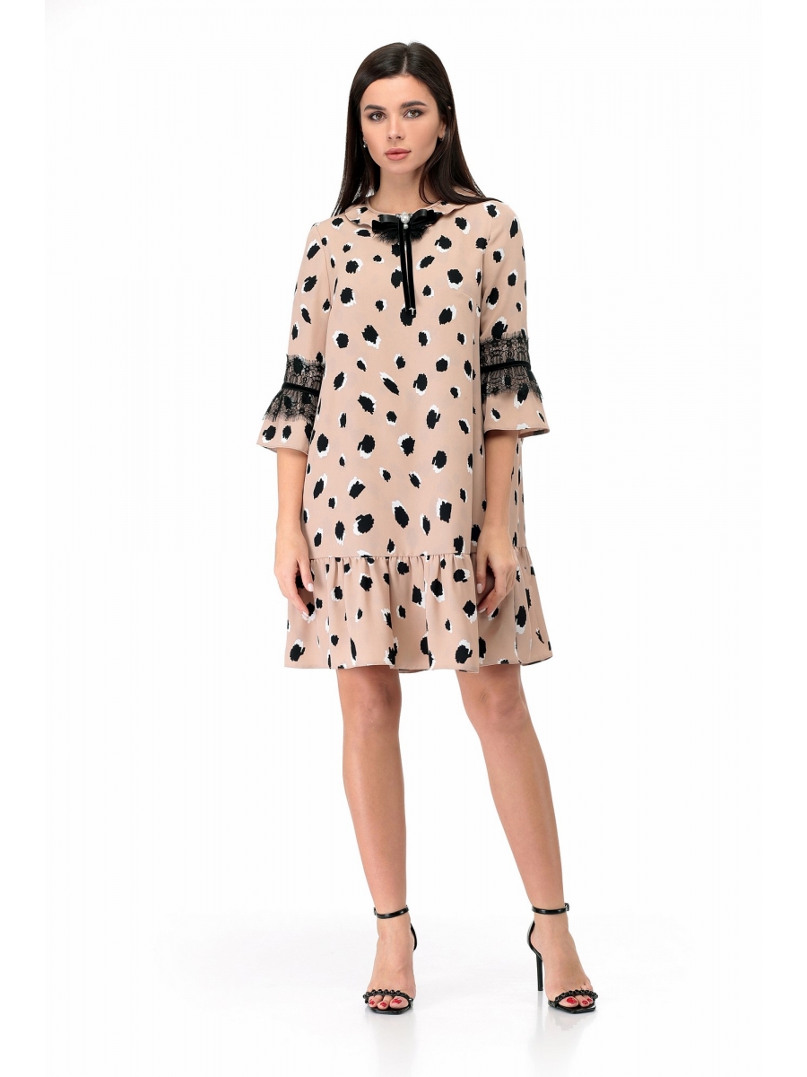 Платье свободного силуэта. Рукав втачной, одношовный. Застежка сзади на петлю и пуговицу. Низ платья и рукава с воланом. Волан рукава декорирован кружевом и бархатной тесьмой. Горловина украшена воланом и пришивным украшением с бусинами и тесьмой.