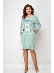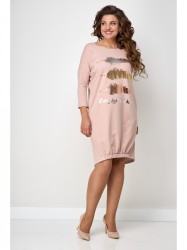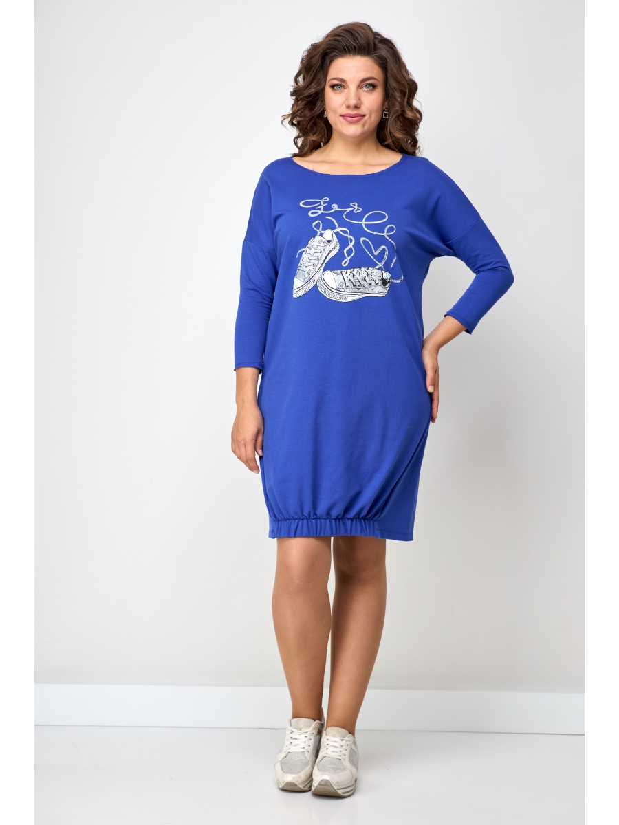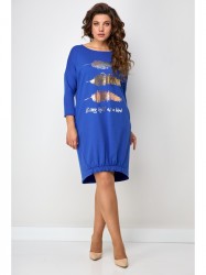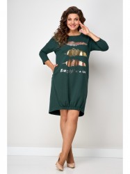 Платье свободного силуэта со спущенным рукавом. Горловина округлая. Рукав ¾. По низу боковой шов смещенный. Спинка переходит на переднюю часть полочки, за счет этого визуально уменьшается размер и фигура кажется стройнее. Низ полочки на широком (3см) резинке, платье не кажется объемным, на ширину шага не влияет. Украшением платья служит термо-печать.