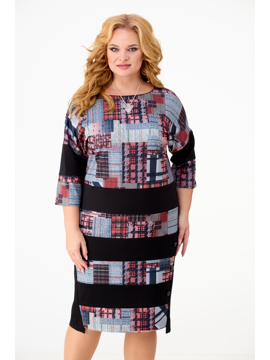 Платье из трикотажного полотна с контрастными отделочными деталями. Полуприлегающий силуэт с геометрическими конструкторскими линиями по переду и цельнокроеным рукавам. Нижние боковые детали дополнены пуговицами. Вырез горловины округлый, обработан отделочной деталью. Спинка со средним швом. Дополнено съёмным декоративным украшением.