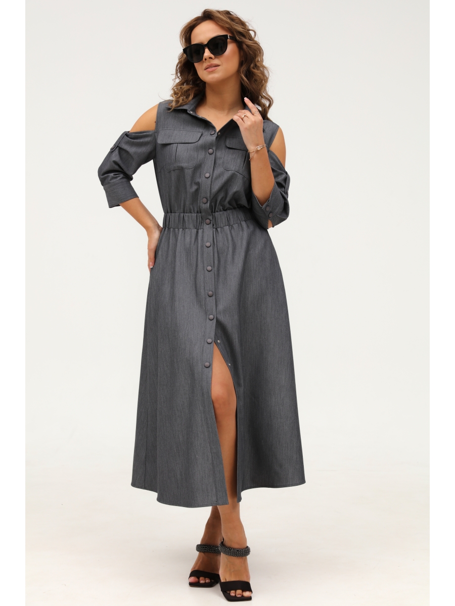 Платье полуприлегающего силуэта, расклешенное книзу. Воротник отложной, на притачной стойке. Платье отрезное по линии талии, на широкой резинке. Платье с центральной застежкой на кнопки на притачных планках. Полочка с нагрудными вытачками и накладными карманами со складкой и клапаном. В боковых швах юбки функциональные карманы. Рукав втачной длинной 3/4, с открытым плечом и декоративной патой на кнопке, понизу - широкая притачная манжета с застежкой на кнопки.