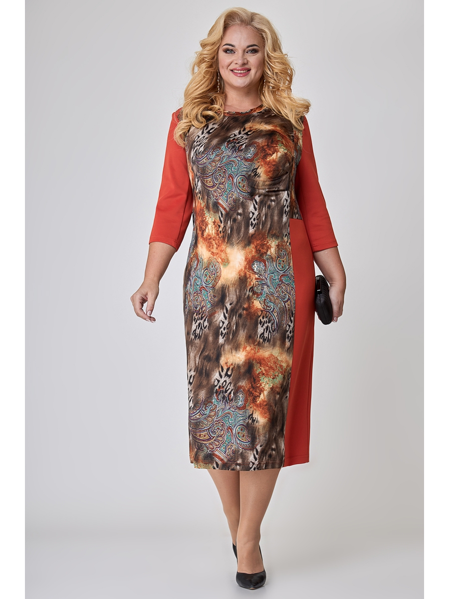 Трикотажное платье прямого силуэта длины миди. Простые линии придают женскому облику изысканность и лаконичность. Благодаря универсальности, модель подойдет на любой случай. Спинка платья со средним швом, в котором есть потайная молния, небольшая шлица. По переду платья есть рельефные швы от пройм. В правом рельефном шве - карман, а в левой центральной части в области груди - драпировка. Рукава длиной 3\4, двухшовные. Вырез горловины круглый, обработанный планкой из отделочной ткани. Контрастное сочетание двух тканей по переду отлично выделяет платье и делает его ярче.