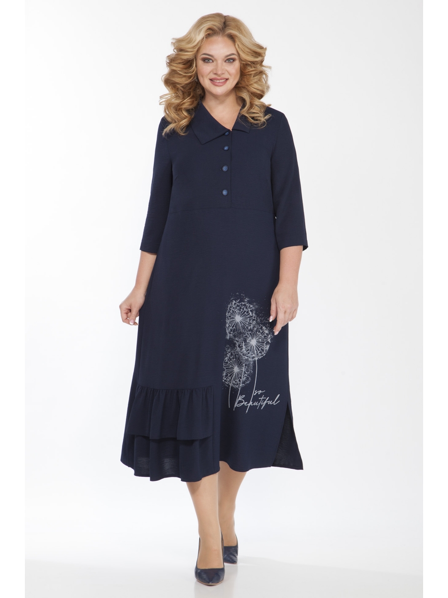 Платье женское прямого силуэта с отрезным лифом по переду и центральной застежкой на пуговицы до линии талии с отложным воротником. По низу изделия с правой стороны выполнен декоративный волан-вставка, слева печать. В боковых швах выполнены разрезы и по линии бедер карманы в швах. Рукав втачной 3/4.