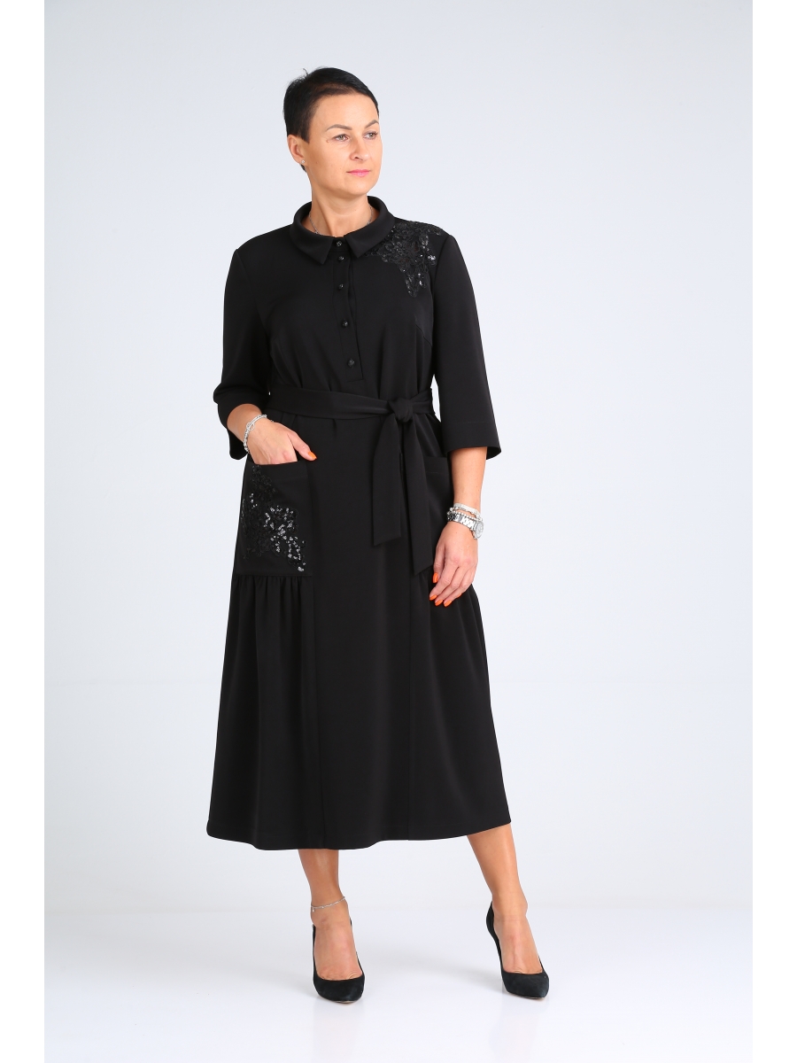 Платье женское полуприлегающего силуэта. Застежка на петли и пуговицы. На переде обработаны накладные карманы. Платье декорировано аппликациями из пайеток.