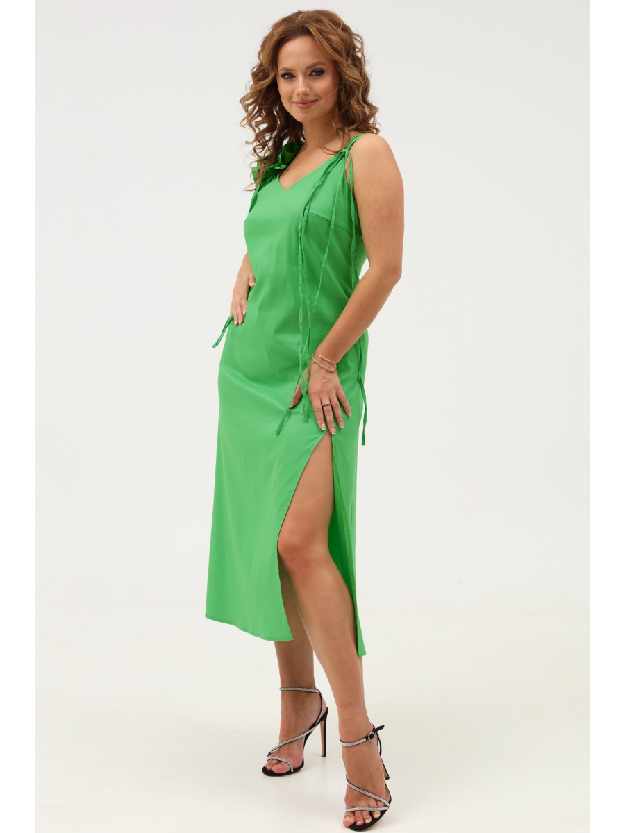 Платье полуприлегающее А-силуэта с тонкими бретелями на завязках. Горловина по переду V-образной формы. По переду нагрудные вытачки и разрез, а спинка - с рельефами. Застежка на потайную молнию в боковом шве. В комплекте съемные рюши на бретели из основной ткани.