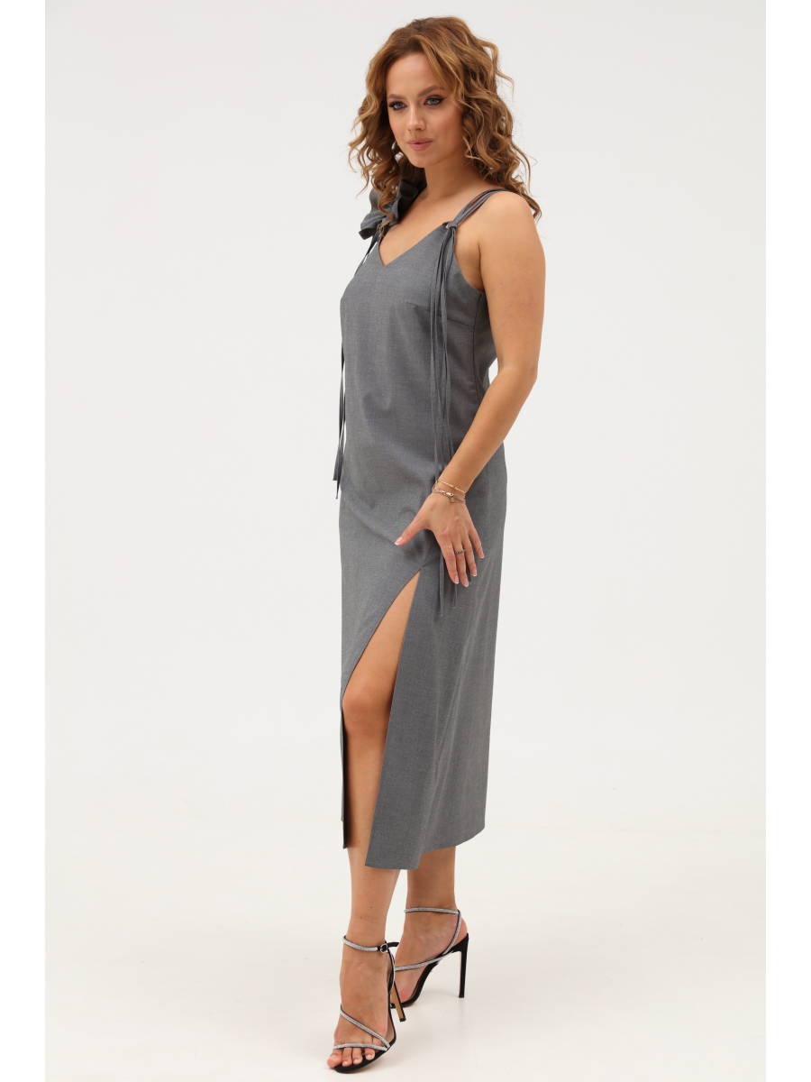 Платье полуприлегающее А-силуэта с тонкими бретелями на завязках. Горловина по переду V-образной формы. По переду нагрудные вытачки, а спинка - с рельефами. Застежка на потайную молнию в боковом шве.