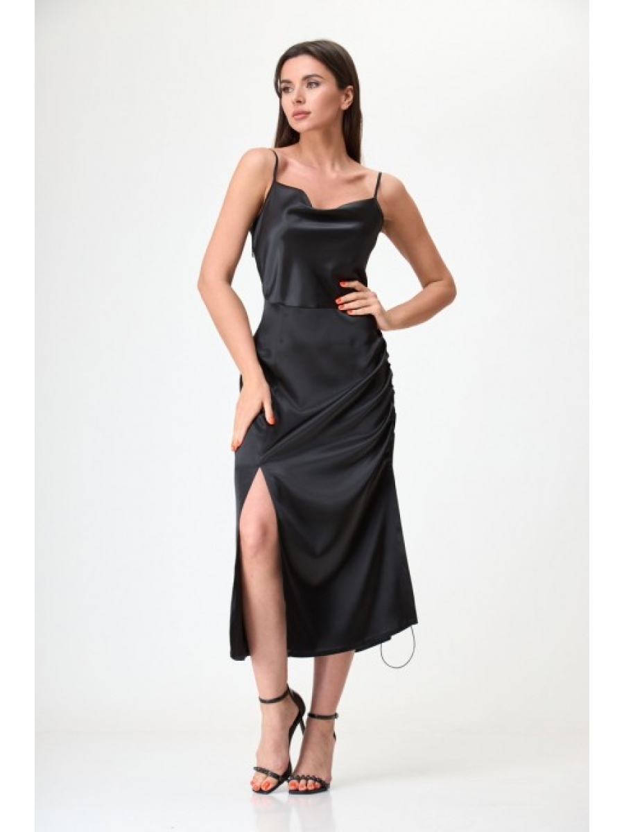 Платье женское полуприлегающего силуэта, на бретелях, длина миди. По переду качеля, отрезное по талии. Спереди по юбке игривый разрез. По боковому шву слева функциональный шнурок, благодаря которому вы можете регулировать сборку. В правом боковом шве потайная молния.