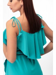 Полуприлегающий силуэт, отрезное по линии талии, нижняя часть платья с запахом и воланом по низу.