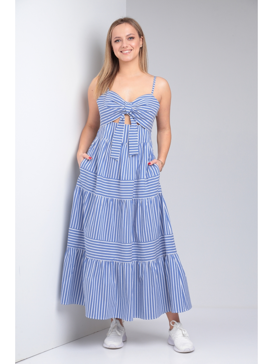 Оформить заказ →Сарафан женский летний в романтическом стиле из хлопокой ткани с нейлоном. Лиф изделия плотно облегающий на регулируемых бретелях, по переду имитация бюстье с отделочным сьемным бантом. Низ сарафана в виде юбки, состоящей из отрезных воланов, присобранных по линии притачивания. В боковом шве потайная молния, функциональные карманы.