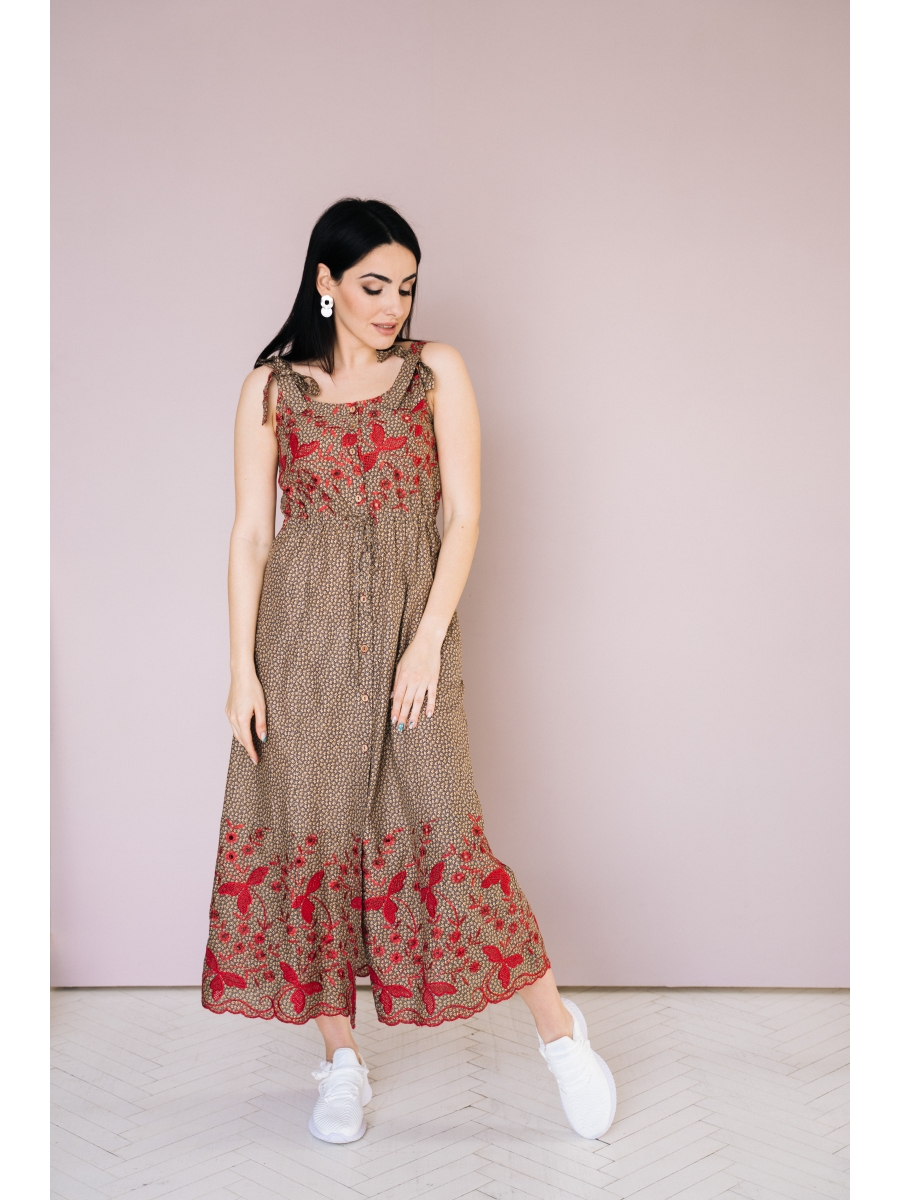 Сарафан женский из плательной ткани с шитьем на широких бретелях. По переду: вертикальные рельефы, планка-застежка на петли и пуговицы. По спинке: вертикальные рельефы. В боковых швах карманы, по линии талии кулиса со шнурком. Вырез горловины и проймы обработан обтачкой. По низу сарафана волан с вышивкой. Бретели сарафана с декоративными бантами.
