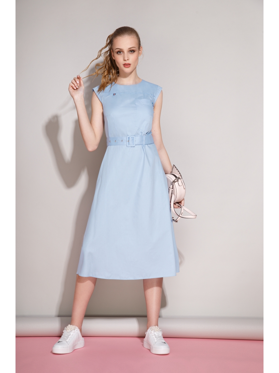 Оформить заказ →Платье из хлопкового полотна полуприталенного силуэта без рукавов, с круглым вырезом горловины, кокеткой по переду, накладным карманом, поясом с пряжкой из того же полотна и застежкой на потайную молнию 60 см. по спинке. Длина изделия - 112 см.