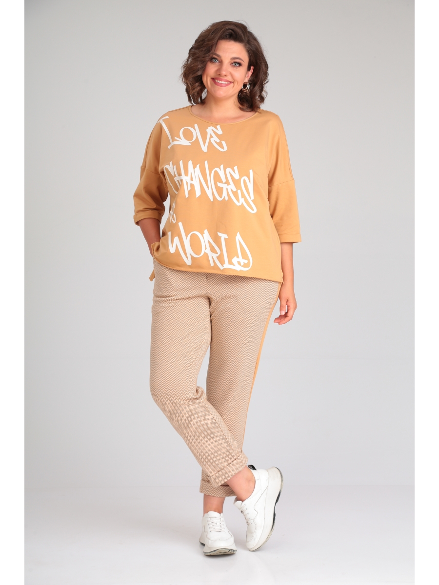 Брюки свободного кроя длиной 7/8, зауженные к низу, по низу брюк цельнокроеная манжета - отворот. По бокам с контрастными лампасами, в боковых швах карманы, пояс на резинке. Оба изделия смело можно сочетать с другими вещами вашего гардероба.