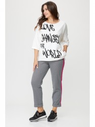 Джемпер свободного кроя (оверсайз) длиной по линии бедер, с округлой горловиной, рукавом 3/4 и цельнокроеной манжетой (отворот на лицо). По переду джемпер декорирован принтом.