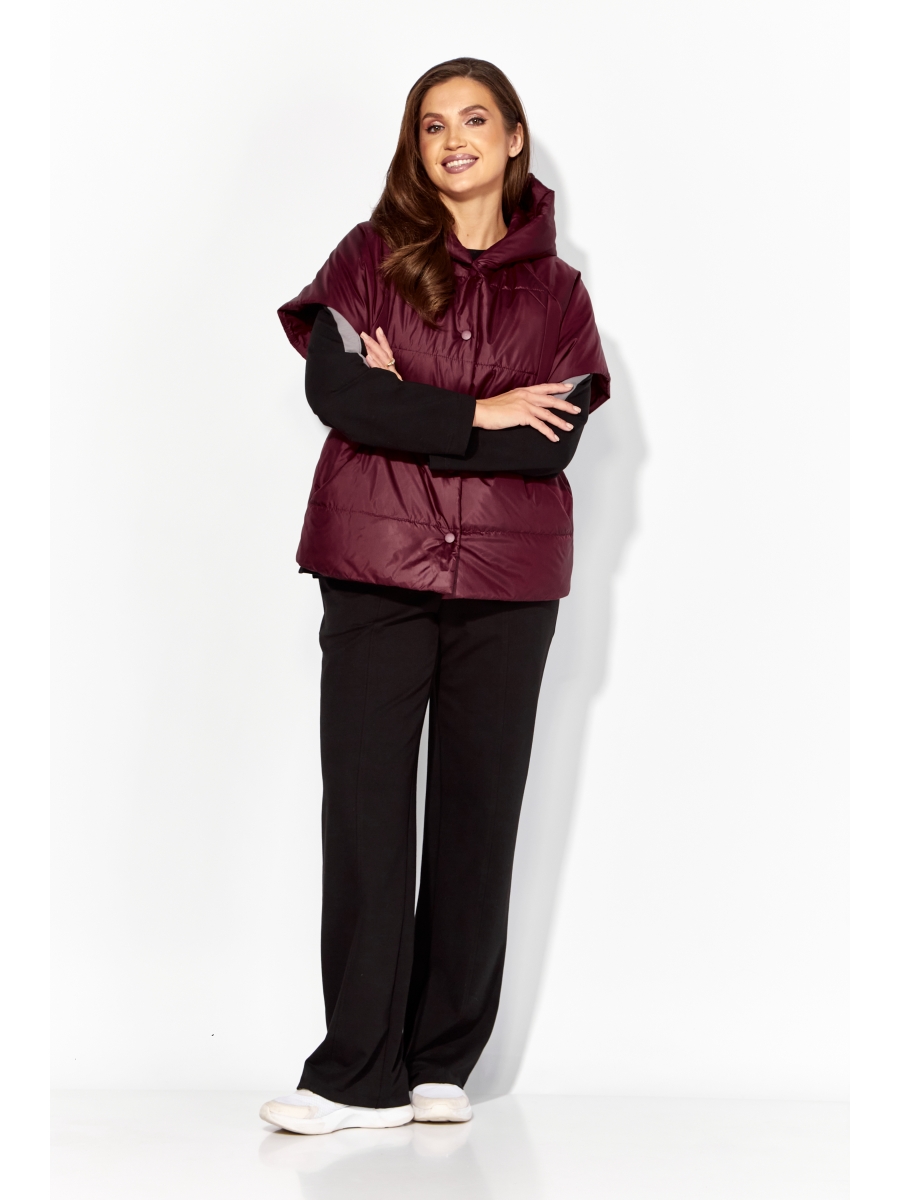 Жилетка прямого силуэта со спущенным рукавом "реглан" По переду рельефы и карманы в рельефах. Спинка и центральная часть переда простеганы. Застежка центральная, на кнопки. Горловина оформлена капюшоном. Низ жилета, по спинке, слегка удлинён. На спинке декоративная нашивка. Жилет изготовлен из плащевой ткани, на синтепоне(VS-100) и на подкладке.