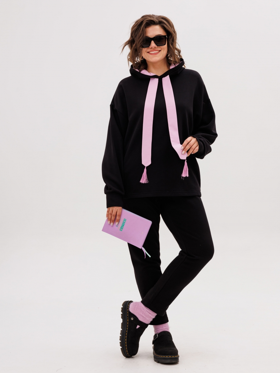 Худи свободного кроя дополнен практичными деталями: удобный капюшон на подкладке, функциональные карманы, скрытые в боковых швах. Декоративные элементы из ткани-компаньона придают модели индивидуальность.