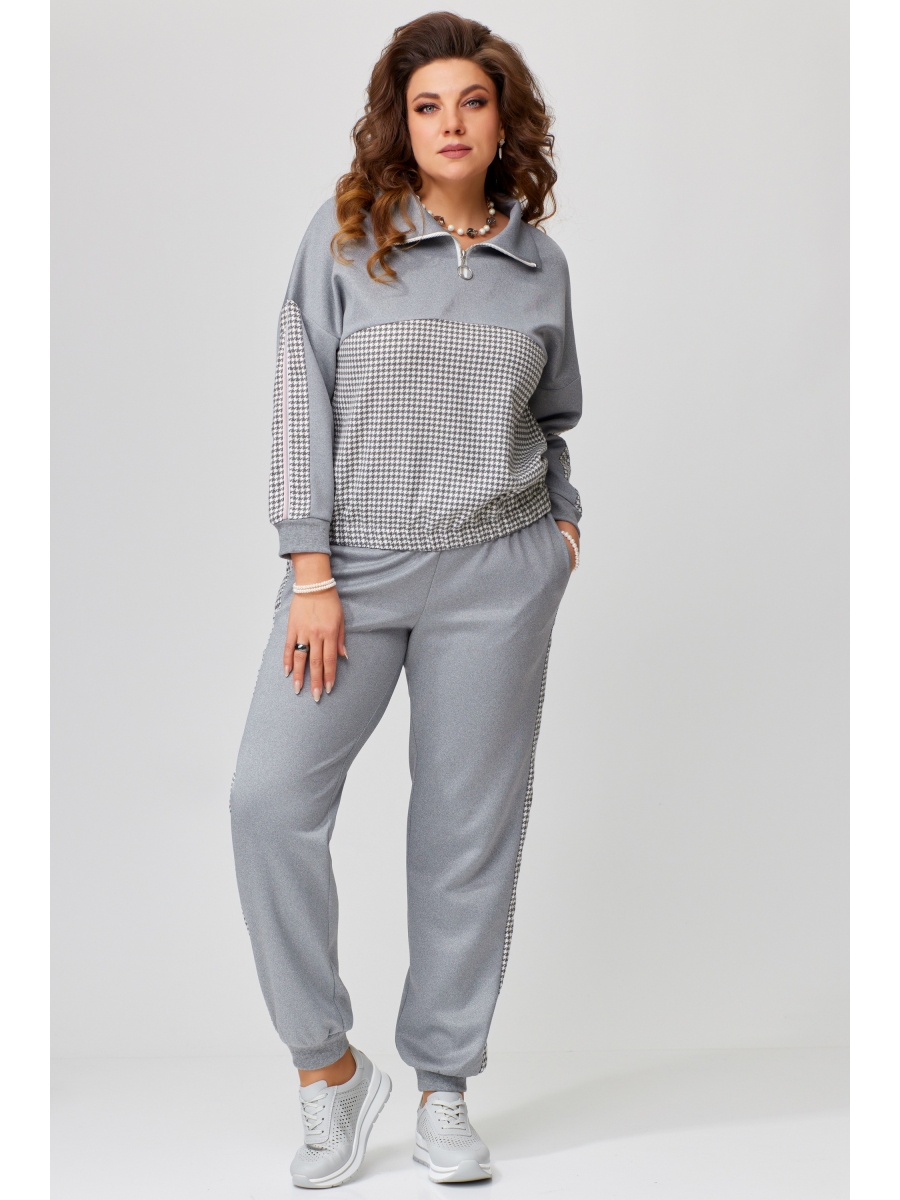Джемпер без подкладки, свободного покроя со спущенным рукавом. Воротник-стойка с застежкой на молнии, по спинке и полочке кокетка из трикотажной ткани, подрезы по спинке и полочке из текстильной ткани с рисунком гусиной лапки. По рукаву вставка из текстильной ткани с настроченной декоративной тесьмой. По низу джемпера резинка, по низу рукава - манжет.