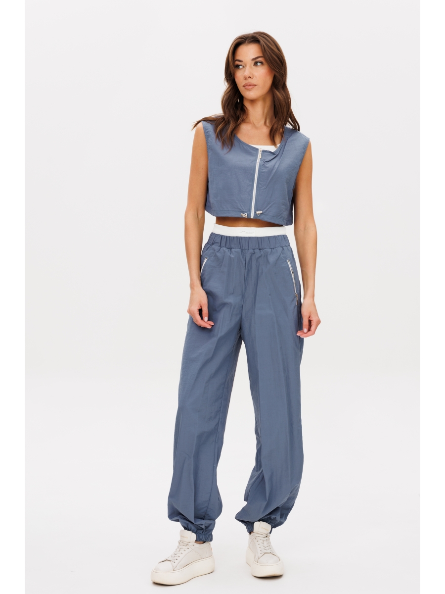 Брюки в свободном, расслабленном стиле, на эластичном поясе с прорезными карманами на молнии. Пояс с дополнительным эластичным поясом из трикотажного кашкорсе.
