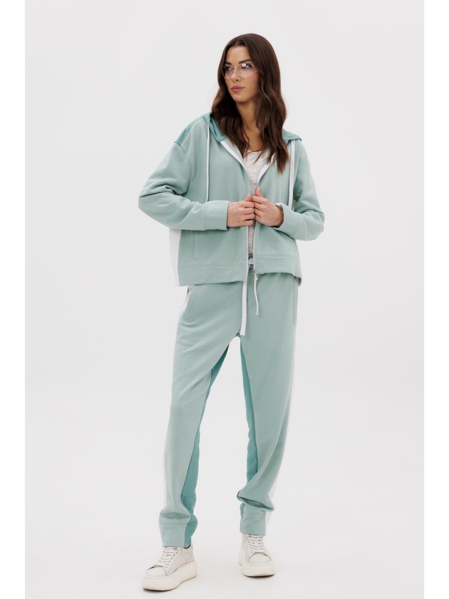Толстовка свободного силуэта, рубашечного покроя с заниженной линией плеча, рукавом, расширенным в области оката, на притачной манжете, центральной застёжкой на тесьму-молнию и капюшоном с люверсами и отделочным шнуром. Полочка с прорезным карманом с листочкой. По низу изделия - притачной пояс.