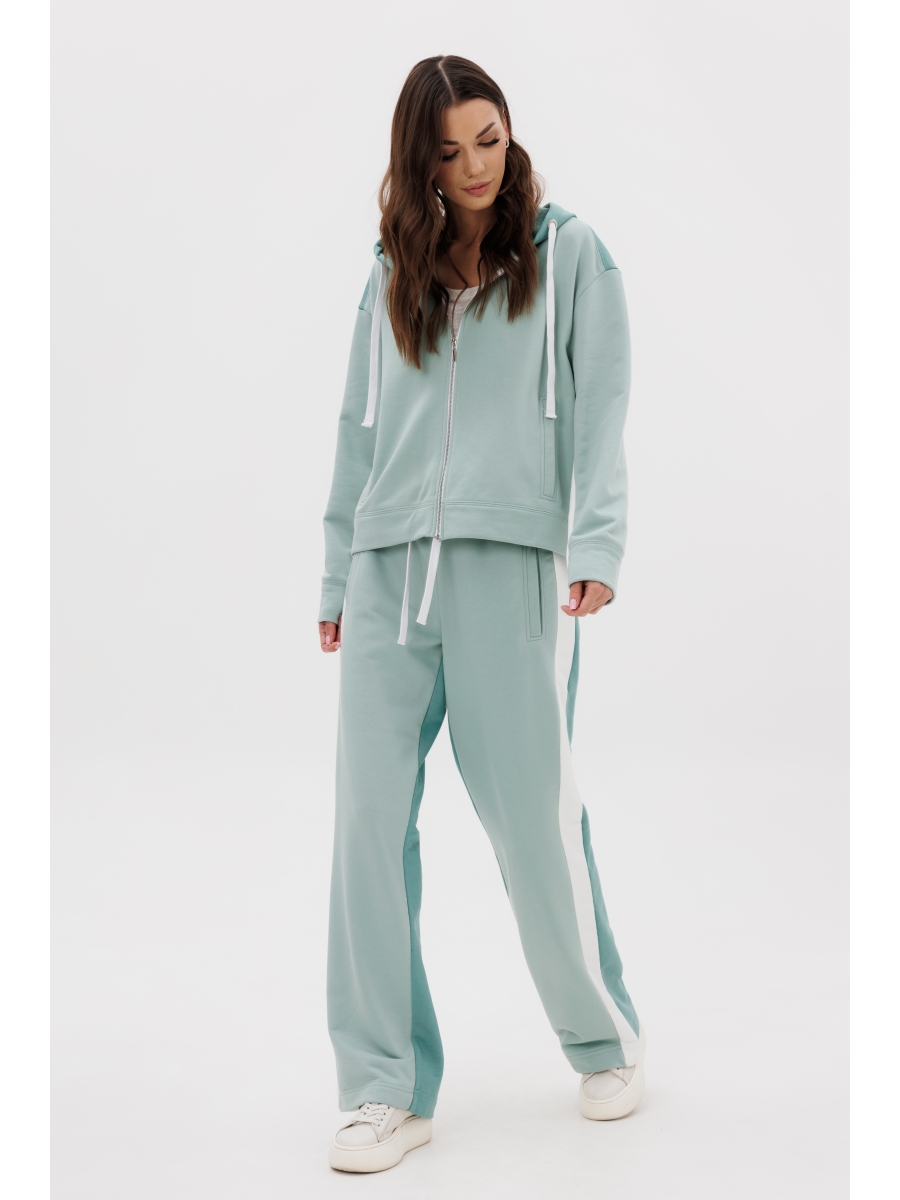 Толстовка свободного силуэта, рубашечного покроя с заниженной линией плеча, рукавом, расширенным в области оката, на притачной манжете, центральной застёжкой на тесьму-молнию и капюшоном с люверсами и отделочным шнуром. Полочка с прорезным карманом с листочкой. По низу изделия - притачной пояс.