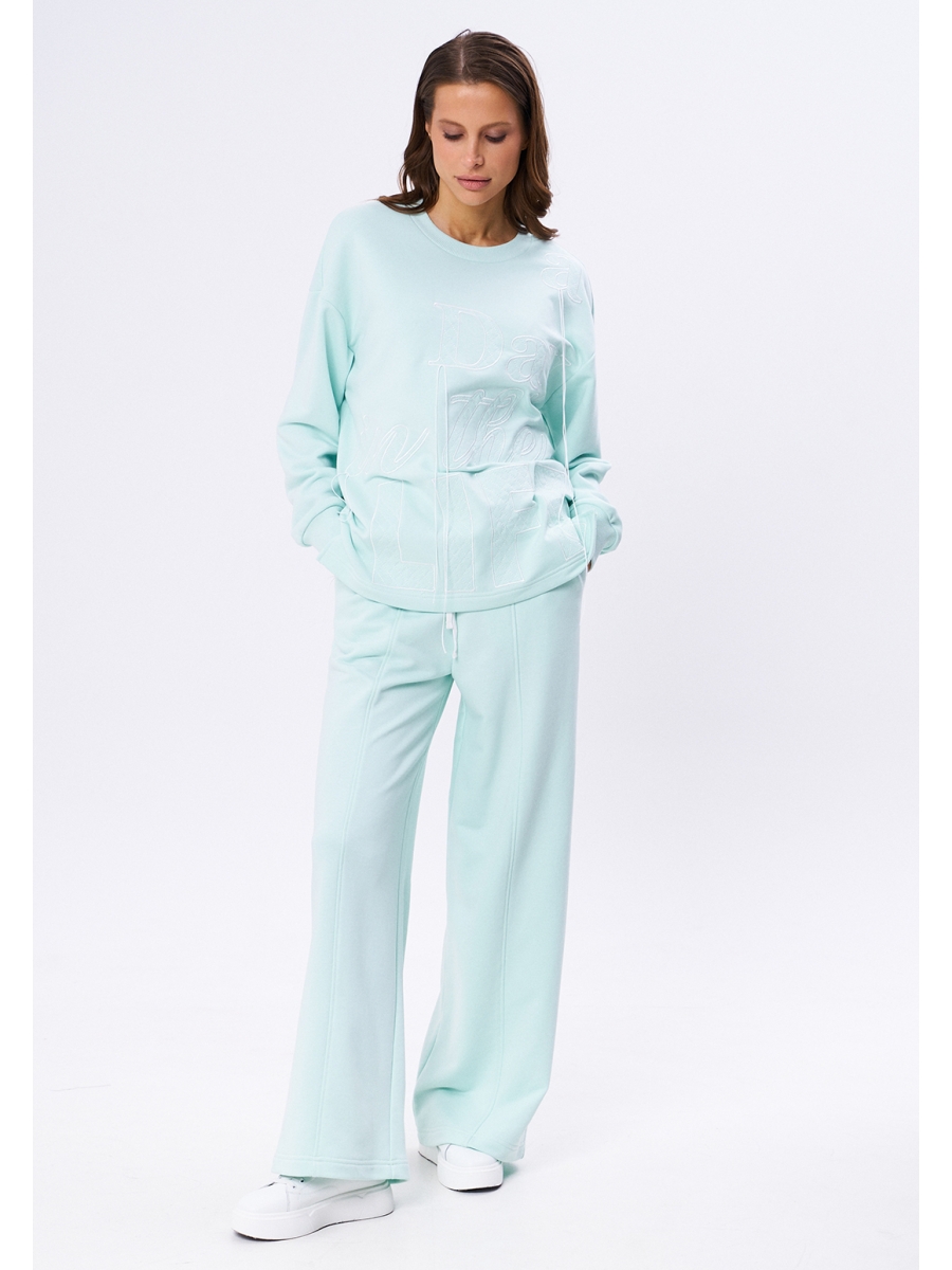 Объёмный джемпер из футера 3-х нитки с довязами на манжетах и по горловине. По переду контрастная вышивка.