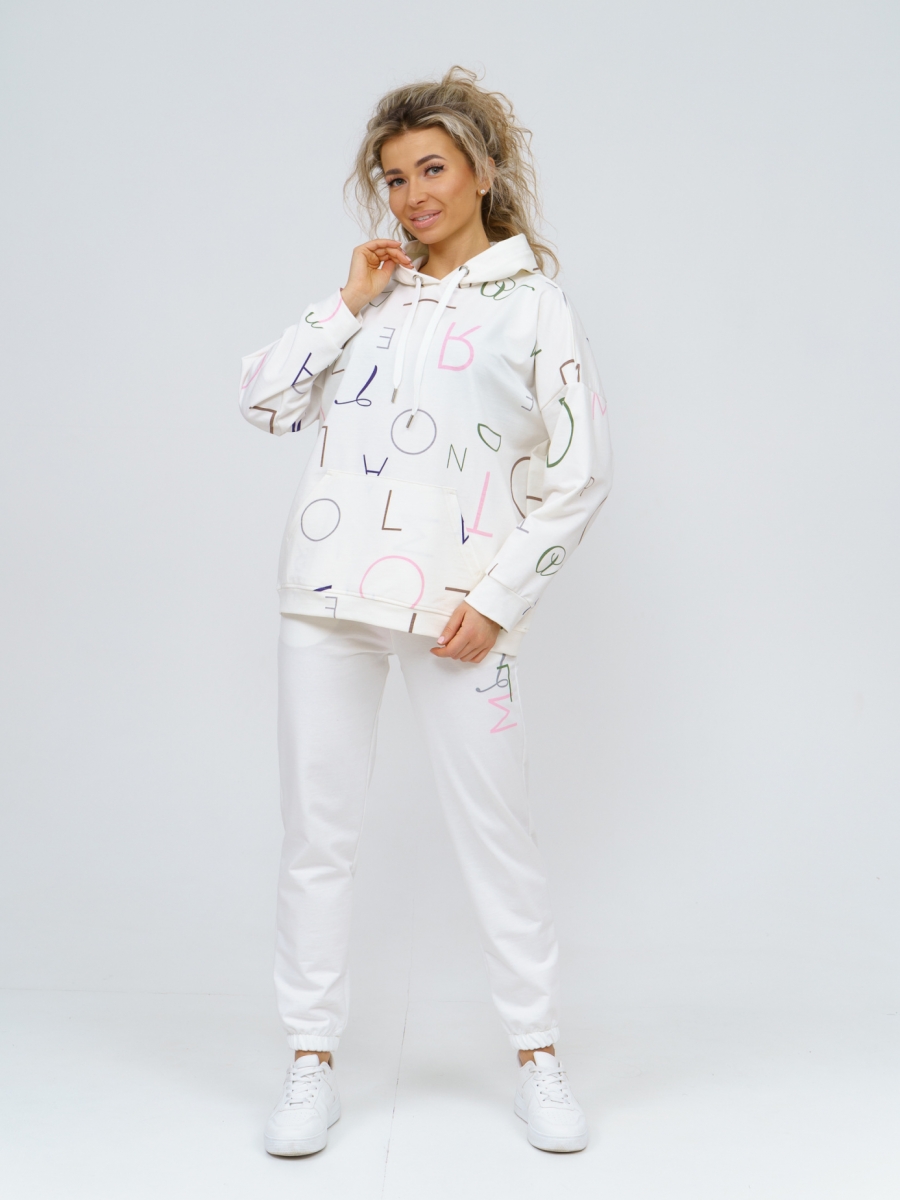 Оформить заказ →Костюм женский с карманом кенгуру выполнен из высококачественного полотна (футер 2-х нитка) качества пенье. Худи прямого силуэта, длиной до линии бедра. Горловина округлой формы, обработана капюшоном на кулисе. Спущенная линия плеча . Рукав длинный на притачном манжете. По низу изделия притачная планка. Брюки прямого покроя, слегка зауженные к низу, с наклонными карманами в боковых швах. Изделие с комфортной посадкой по талии. Пояс притачной на эластичную тесьму. Декор-дизайнерский принт с левой стороны переднего полотнища.