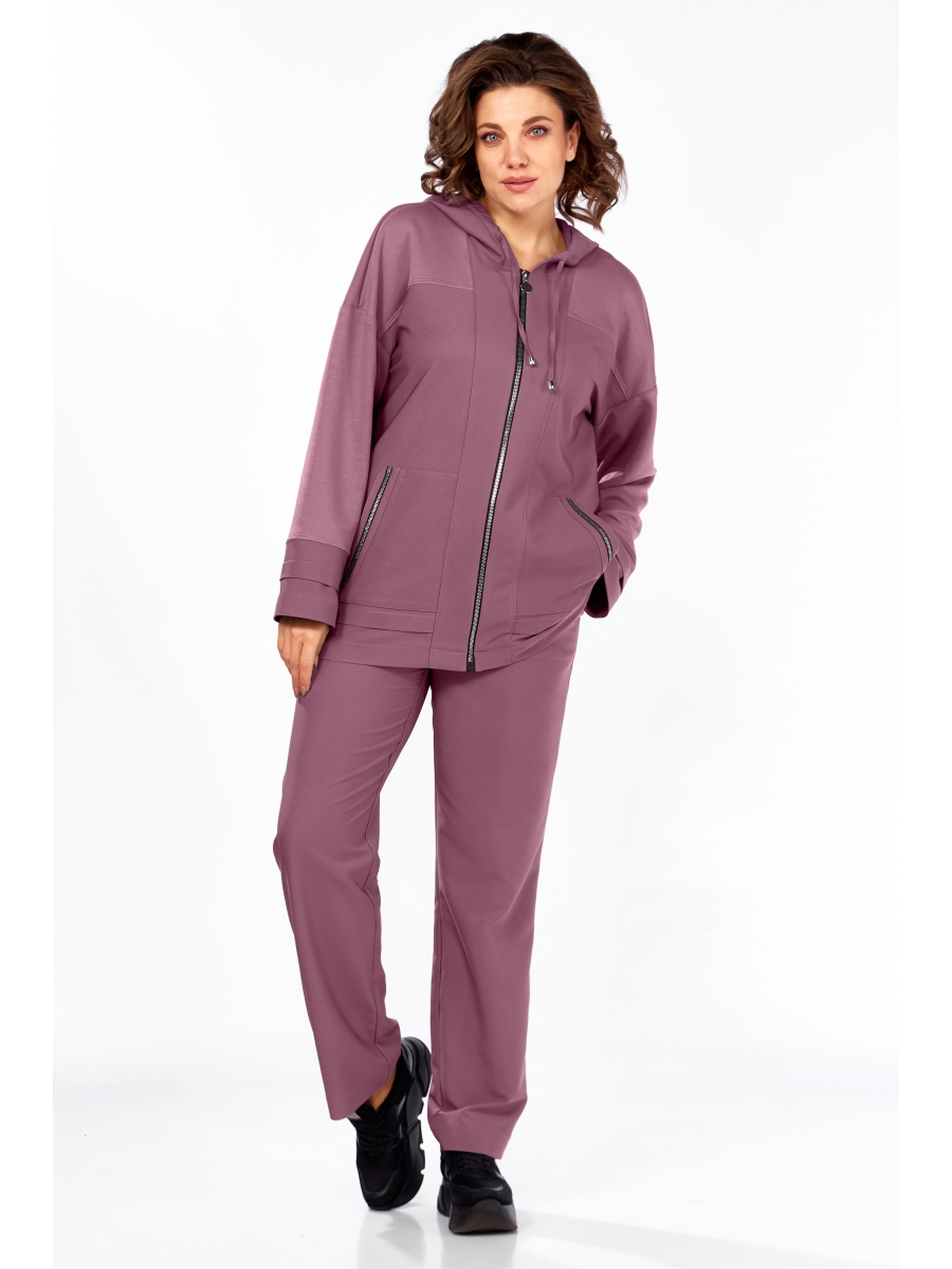 Жакет-худи с центральной застёжкой на молнию, имеет спущенную линию плеча. На переде обработаны кокетки, планки, накладные карманы с отделочной тесьмой, по низу застрочены декоративные складки. Спинка с кокеткой и средним швом. Рукав спущенный, длинный, на манжете заложена декоративная складка. Горловина обработана притачным капюшоном с кулисой.